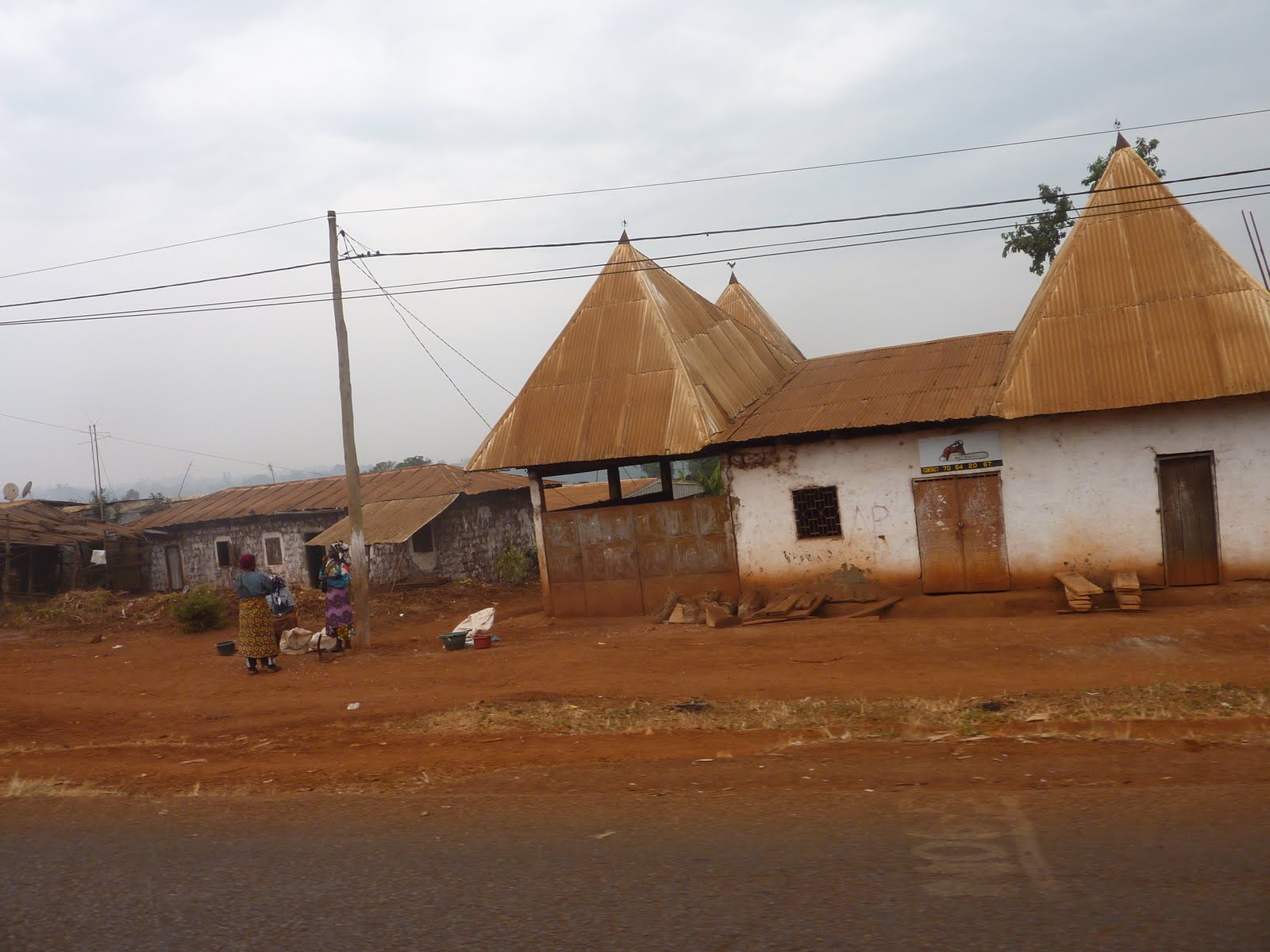 --Our laundry is all clean again, thanks to the helpful rest house staff. All our belongings were loaded, and we and left Bamenda by 7 am, going generally south for a couple of hours We stopped at a roadside place for breakfast of locally grown spicy black beans and rice, and avocado that we brought with us – I can’t say enough good things about this meal! Back in the truck and on down the road, paved nearly all the way, to Bafoussam and then on a little farther to Foumban to visit a large Fon's palace. Along the way the houses changed from flat or thatched roofs to tall tin pyramids.